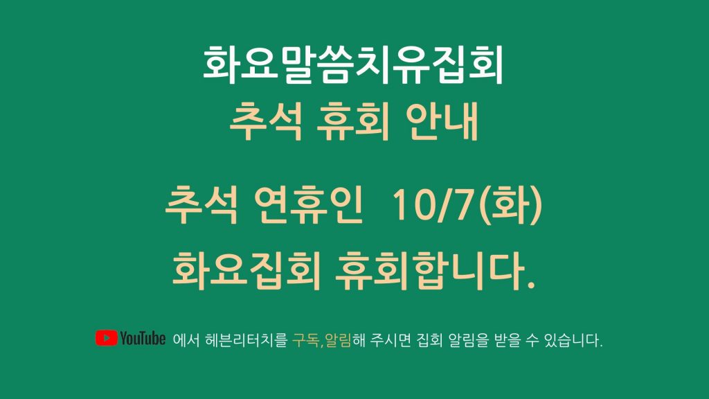 공지사항 2025년 9월 22일 HTM 0 10/7 추석 연휴 휴회 안내 180 0 180 더보기 지금 보고 있는 글 10/7 추석 연휴 휴회 안내 2025년 9월 22일 HTM 재생 중 youtube(www.youtube.com) 공식채널 안내 2025년 9월 22일 HTM 태그: XTHUMBSLIDER-2 180 이전 25년 11월 손기철장로 초청 일본집회
