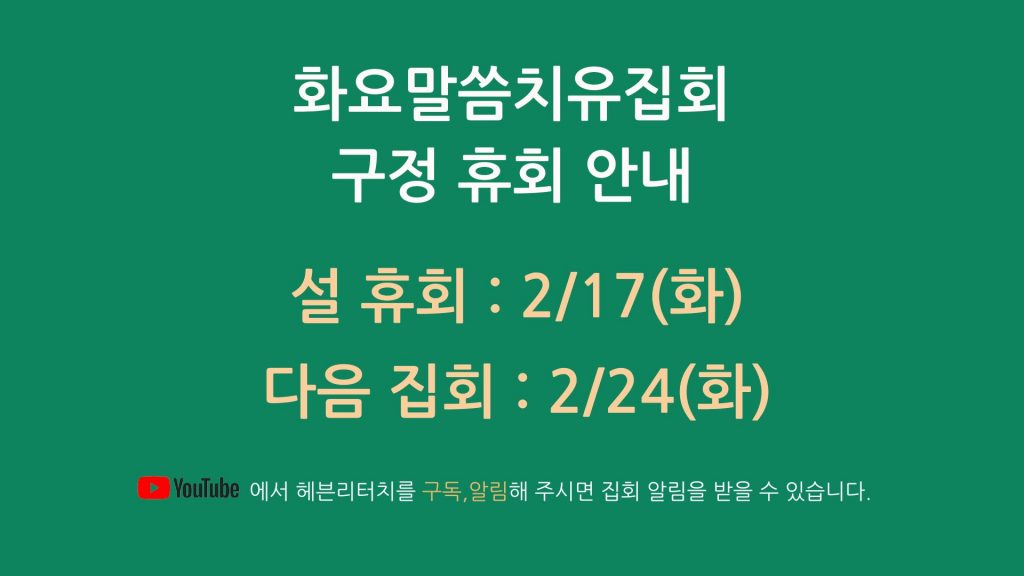 공지사항 2026년 2월 10일 HTM 0 2/17 설 연휴 휴회 안내 17 0 17 더보기 지금 보고 있는 글 2/17 설 연휴 휴회 안내 2026년 2월 10일 HTM 재생 중 (마감)1기 영적전쟁 세미나 2026년 2월 10일 HTM 재생 중 (북미주) 4기 킹덤토크와 새마음 훈련 모집 2026년 2월 10일 HTM 재생 중 화요집회 휴회/개회 안내 2026년 2월 10일 HTM 재생 중 말씀 라디오 2026년 2월 10일 HTM 재생 중 HTMGlobal YouTube open 2026년 2월 10일 HTM 태그: XTHUMBSLIDER-1 17 이전 화요집회 휴회/개회 안내
